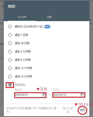 「カスタム」へチェックを入れ、開始日と終了日を入力後、適用をクリックします。