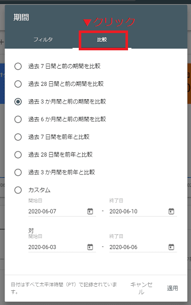 「比較」の場所をクリックすることで、それぞれの指定期間のデータを比較することができます。